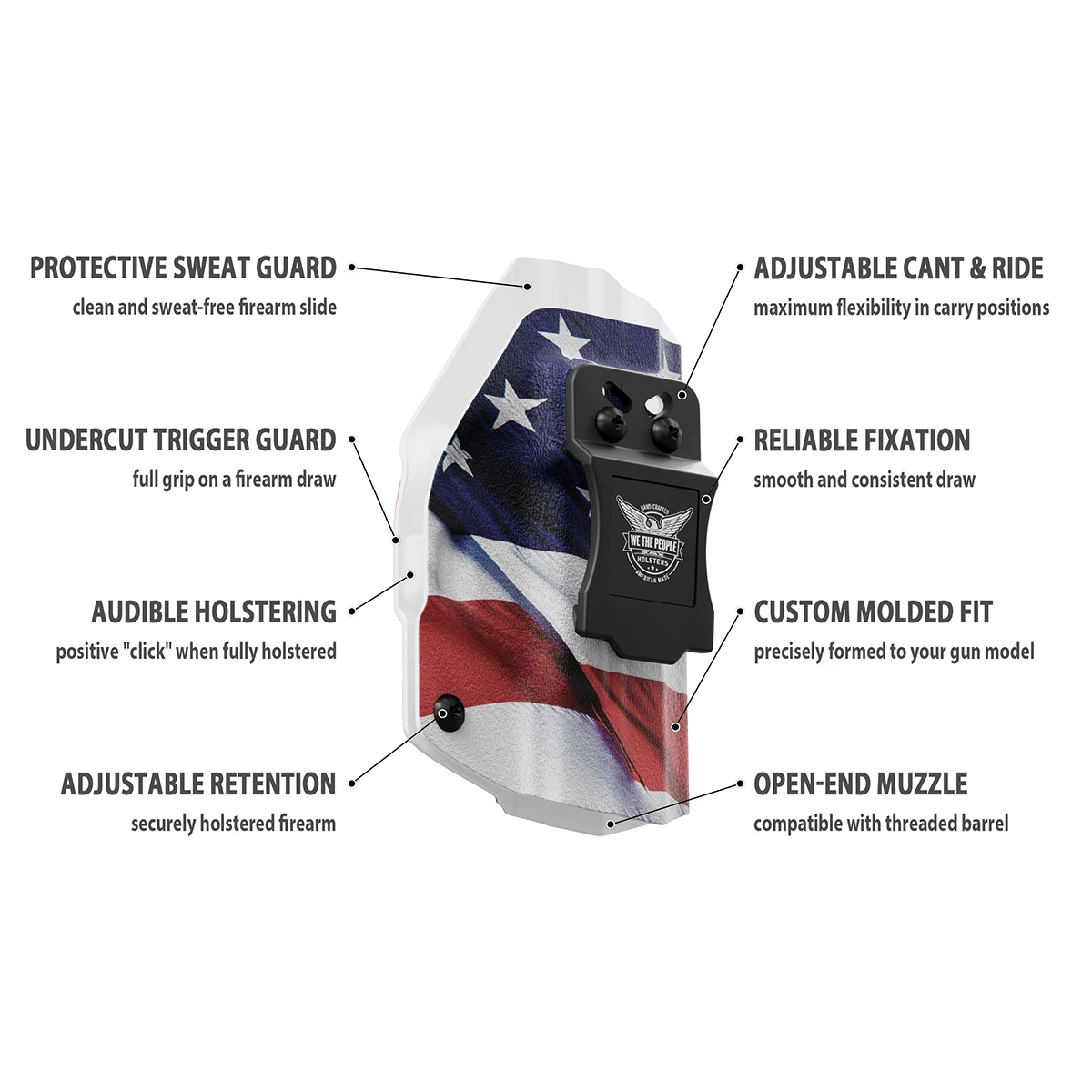 Lightweight, durable, this inside-the-waistband holster is manufactured in the United States utilizing .08-inch KYDEX, a material that adds just three ounces in weight but is thick and rigid enough to maintain its structure even under the most demanding conditions. With a thin profile and readily adjustable retention pressure and carry angle, this holster offers ideal concealment, comfort, protection, and durability.