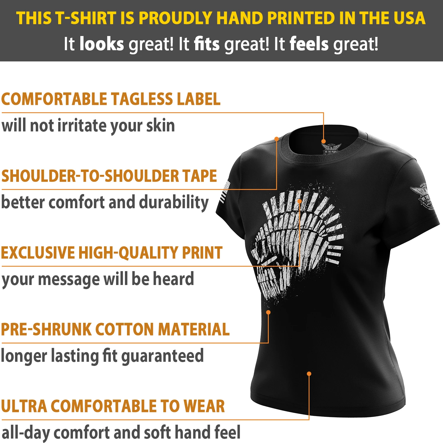 Wear this shirt loud and proud! Our exclusive shirt is proudly 100% MADE IN THE USA. That’s right – from where the cotton is grown all the way to where the bad*** design was printed – EVERYTHING about this item was made right here in America! Now you can stop buying other brands’ so-called “patriotic” shirts that were made overseas.