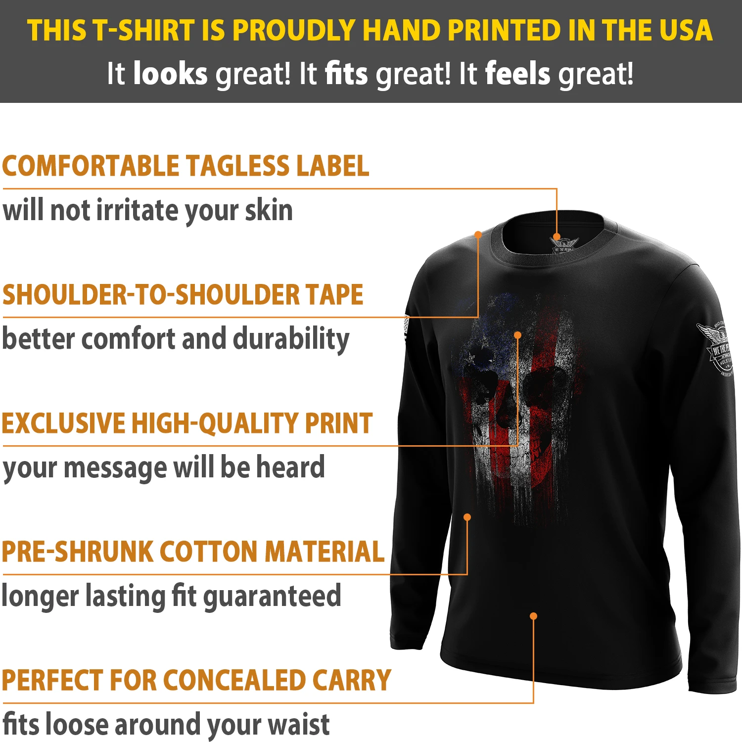 Wear this shirt loud and proud! Our exclusive shirt is proudly 100% MADE IN THE USA. That’s right – from where the cotton is grown all the way to where the bad*** design was printed – EVERYTHING about this item was made right here in America! Now you can stop buying other brands’ so-called “patriotic” shirts that were made overseas.