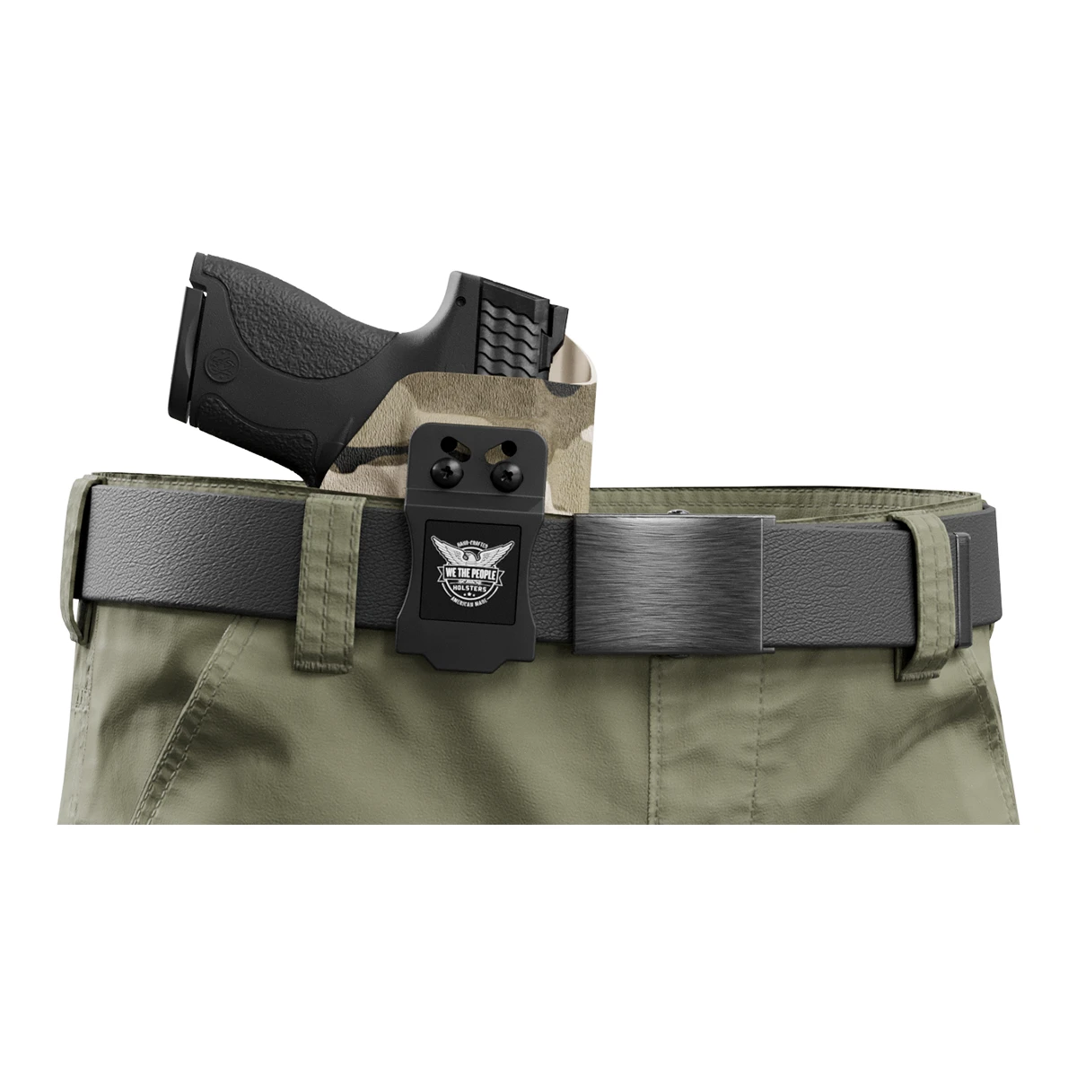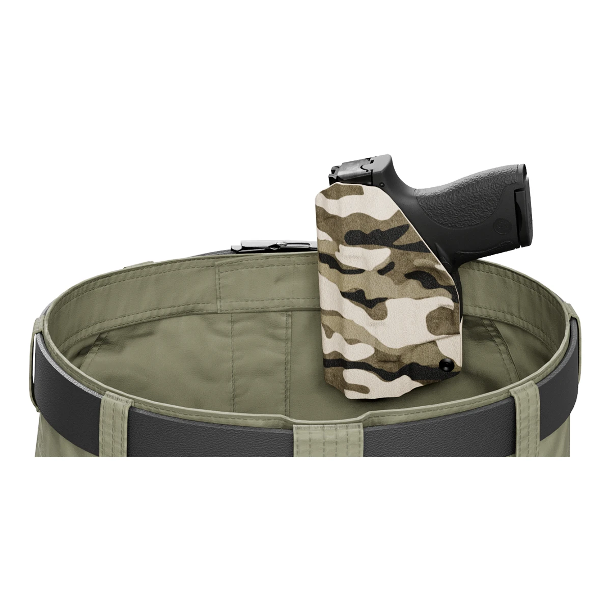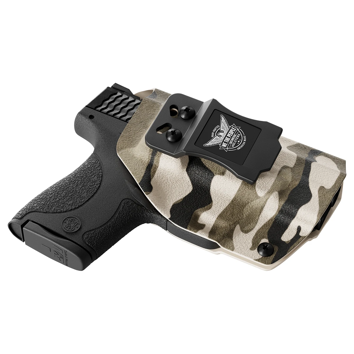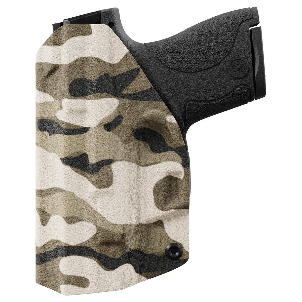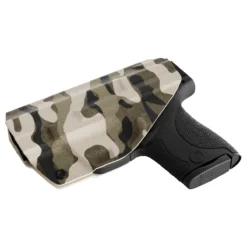 This custom designed tan camouflage printed holster is made out of .08 inch durable kydex. Each model holster is custom designed to have a snap in perfect fit. When you holster your weapon you will hear a nice click when your weapon is secure. This holster features adjustable cant and ride and is made out of strong .08 thick Kydex. Hand made in the USA (pictured gun is an example please choose your gun type and side from the menu)